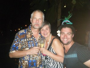 The evening started at sunset at the beach bar with music and champagne. Then off to the Tree Top outdoor restaurant for a sumptuous buffet of seafood and grilled meats. Delish! Lots more champagne to toast the New Year and a show put on by Fijian dancers around the pool. At midnight, there were fireworks and everyone gets thrown in the pool. Leon and I had our concerns during the day when we saw them connecting the neon sign over the pool. We sure hoped nothing would fall into it once we were all swimming and dancing in the water.