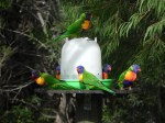 Having solved the persimmon resentments and decided to venture north, we set off early this morning, after a walk on the beach (where the girl was attacked by a shark 3 weeks ago). A lovely morning, still no sharks, dolphins or penguins in sight. We drove about 500km until we stopped for the night in the small town of Yamba. It’s a nice campsite but the mosquitos live here a little too happily, along with a million or so lorikeets. Well maybe a hundred or two. It must be the date palms that attracts them. Leon figures they are hyper from all the sugar they get from the fruit trees. You can judge for yourself from the video he took.