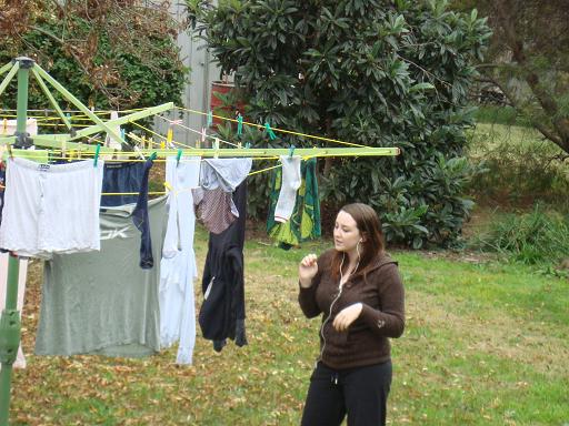 Cloudy day. We are doing all the normal things families do on a weekend – cooking, laundry, renting a video. I got up very late this morning after a good sleep. Leon is gone for 2 weeks, so it’s a good time to catch up on the mundane domestic chores. Ariane and Nick are leaving for Mt. Isa on Monday. They are getting their laundry done, cleaning their room as they go and just relaxing. Earl is helping with laundry and going to work out. I’ve been cooking up some of the ingredients in the fridge before I leave for an overnight stay in Yarrawonga on Monday. So far I’ve made potato salad, chicken noodle soup and a crockpot of beef stew. I have lots of reading to do and plenty of marking. But it’s a slow day. As I was walking back inside from the clothes line, I remembered to pick the pomegranates we have in the tree out back. One was already quite split open so I tasted it. Interesting. It’s like corn kernels filled with sweet red liquid that you suck on and spit out.