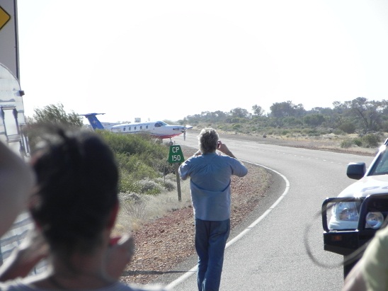 I am sitting in the camper, on the side of the road, where we are stopped to let an airplane take off. It is the Royal Flying Doctors Service emergency runway as well as the Stuart Highway to Alice Springs. And they said there was nothing to see on this road!