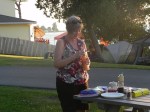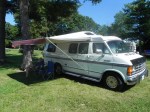 Anyway, we ended up having a lovely dinner of grilled salmon on salad while watching the sun set slowly through the tailgate of the pick-up truck conveniently parked in our line of view. Ah camping… well at least the Roadtrek is really cozy and everything we were hoping for so far. We did notice quite a few people looking at us with envy. One guy in a small Winnebago gave us the thumbs up as he drove past us. Right now we are sitting in the front seats which are rotated to face the rear and become great loungers. The bed is made in the back and it’s just waiting for us to crawl in and try it out for the first time. Let’s see how we feel in the morning. Good night John Boy…
