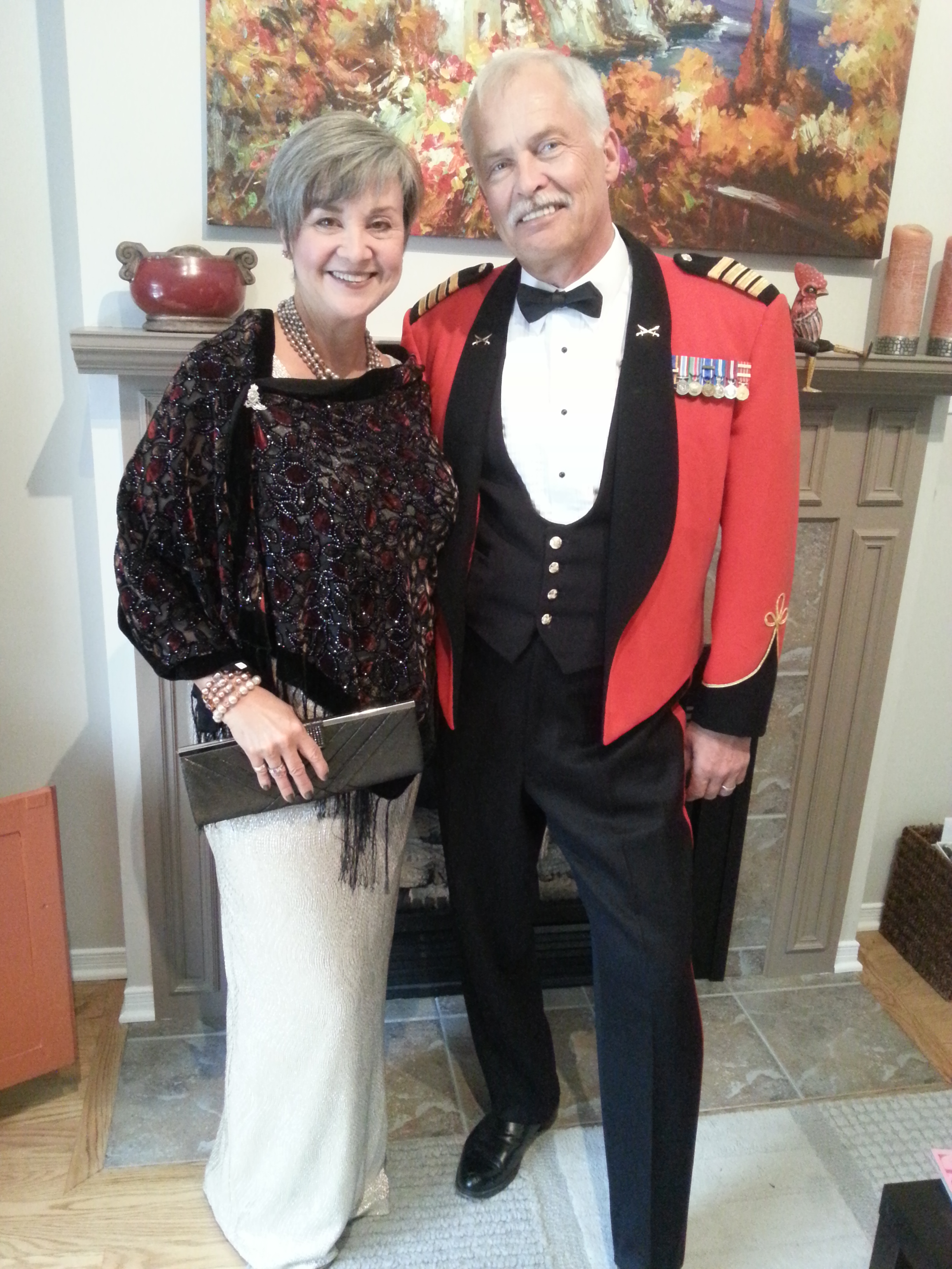 As for the rest of the crowd, the ones not in uniform, well let me say that I did not feel overdressed this year. I had chosen a champagne gown and forgot that so many ladies in Ottawa like to dress conservatively at these affairs, so I was a bit apprehensive about my choice. It turned out there were at least 3 other ladies in gold dresses and an incredible variety of very chic outfits. When you look at how regal the gentlemen look in their finest (sorry, I don’t like the ladies’ dress uniform nearly as much), you can imagine that it’s hard to come up with an outfit that will complement your partner’s, not clash with it. As the weather was unseasonably cold last night, I had considered wearing a fake-fur cape that I borrowed. However, I settled on a pashmina of burned-out velvet that I purchased in Turkey a few years ago, held together with the regimental broach Leon gave me a few years ago. The broach is very special to me as my father was in the Royal Canadian Artillery (as is my husband) and I remember my mother saying how lovely it was to see all the ladies wear their husband’s regimental broachs when they would go out for an evening during the war years (WWII).