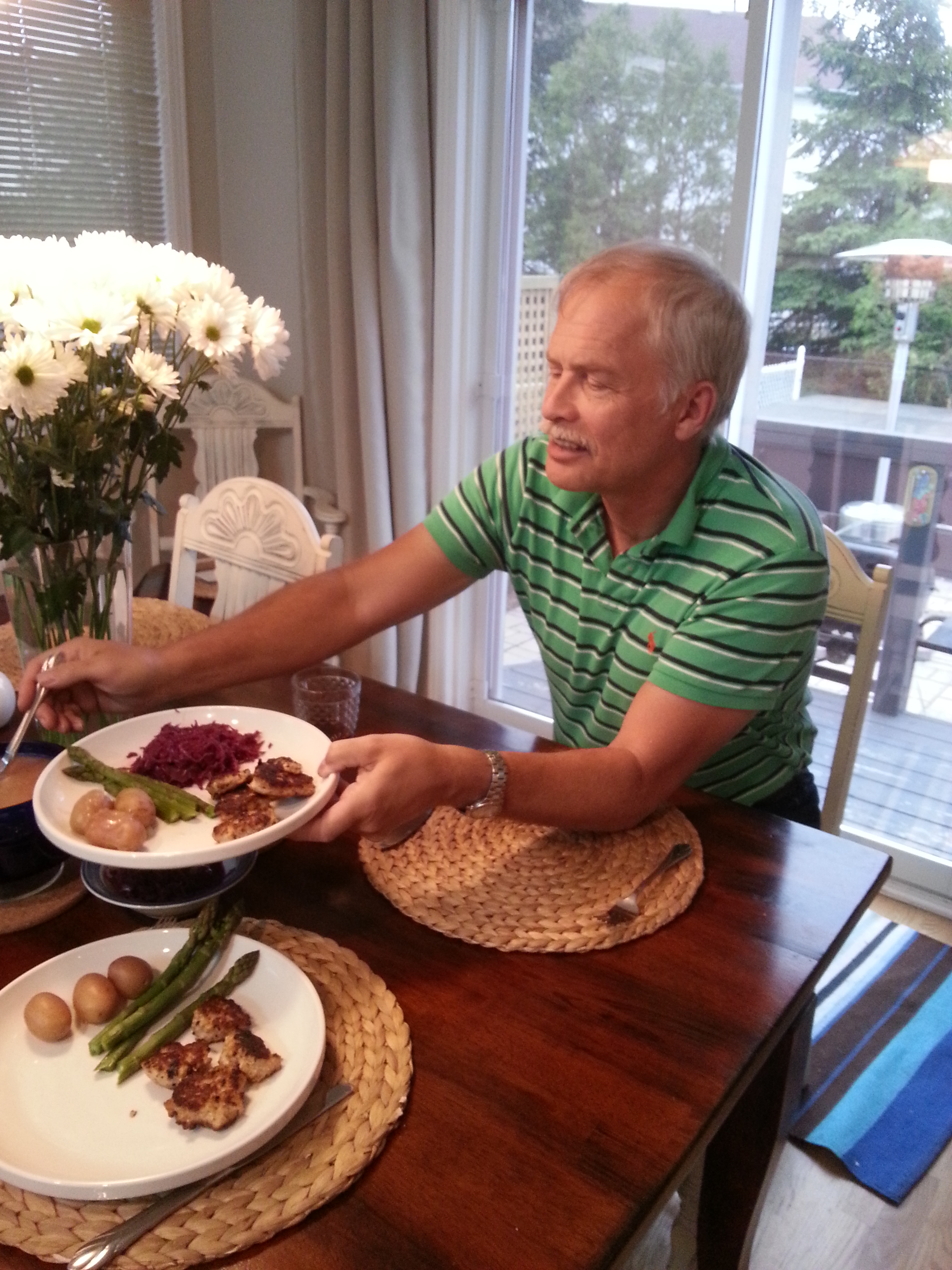 flag of denmarkToday is Leon’s birthday so naturally I cooked some Danish food.  It’s his favourite, after all.  I made Ceasars with Ariane’s Danish Vodka so I could sip as I cooked. The menu was frikadeller (f-eye-ka-della), boiled baby potatoes, brown gravy and red cabbage (rodkaal).  Dessert was rabarber grod (rhubarb stewed with extra sugar and milk added).  It might sound strange but it was really yummy. And the rhubarb was cut fresh from our garden. Leon was making happy noises as he ate.  The asparagus are probably not Danish, but I like a bit of green on the plate.