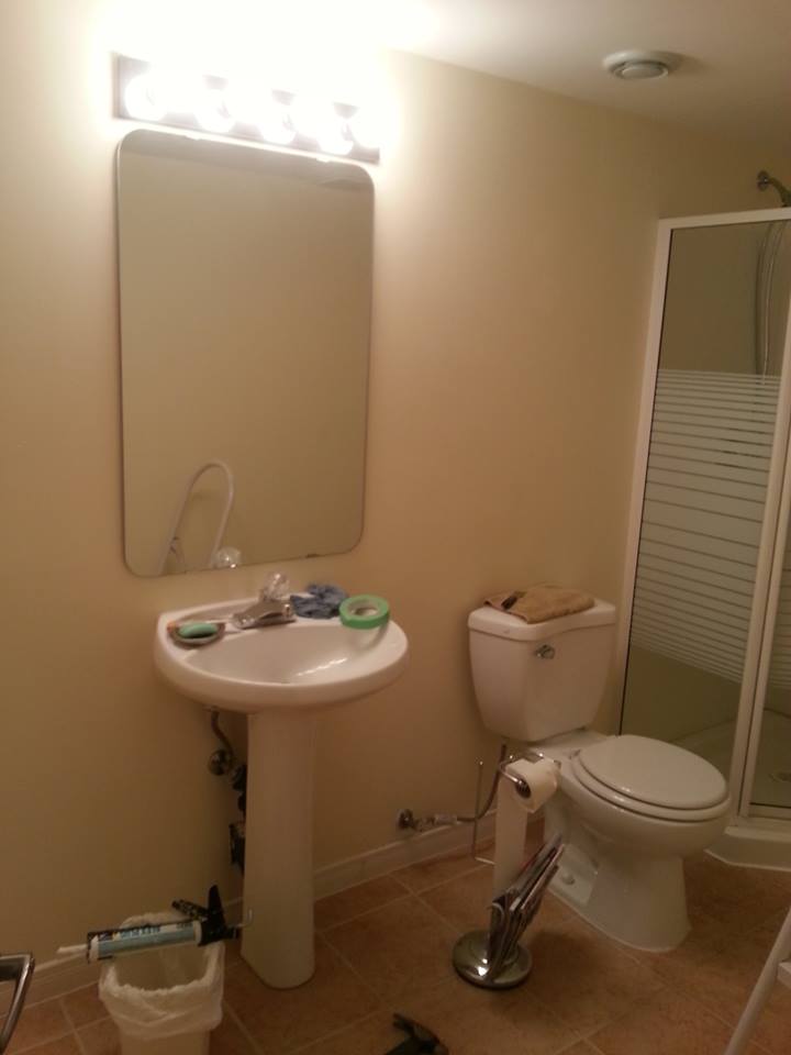 This weekend was a good time to relax and catch up on my private life. School is almost done for the year, so I had a small lull in my marking. Saturday was rainy and it seemed like the perfect opportunity to work on a small reno project I could do without Leon’s assistance. The basement bathroom is one of the few places in the house with regular height ceilings and no fixtures to remove. It’s also really ugly, although quite newly built (2009). I hate the floor tile, which is caramel and brown sugar; the fixtures are minimalist (read cheap) and poorly spaced so they don’t cover the plumbing and drainage pipes very well; the lighting consists of 4 bulbs on a chrome strip, which do nothing to enhance anyone’s appearance, let alone the appearance of the bathroom! The walls are a light shade of yellow – cheery to some, institutional to others. The best part is the liberal use of silicone caulking, around the shower stall, on the baseboards at the wall joint and the floor (they never heard of quarter round?) and on the door frames. Yes, this bathroom is certainly waterproof! It’s also paint proof!