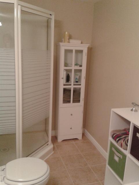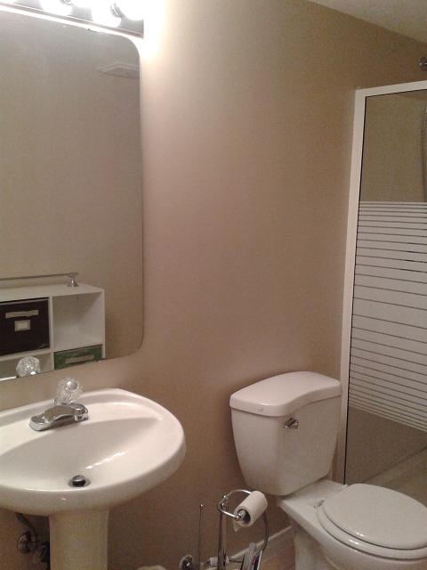 While I was painting, I realized that the brownish floors will never look that good with white cabinets we had planned to install. Drawing inspiration from the Langley bathroom, I am thinking we need to use a darker vanity. We had chosen medium brown kitchen cabinetry for the bathroom in BC, but I don’t think Ikea offers the same finish in the bathroom vanity. I’ll have to do some shopping. In the meantime, the bathroom is ready for use again and I’ll have the summer to think about how to improve it further.
