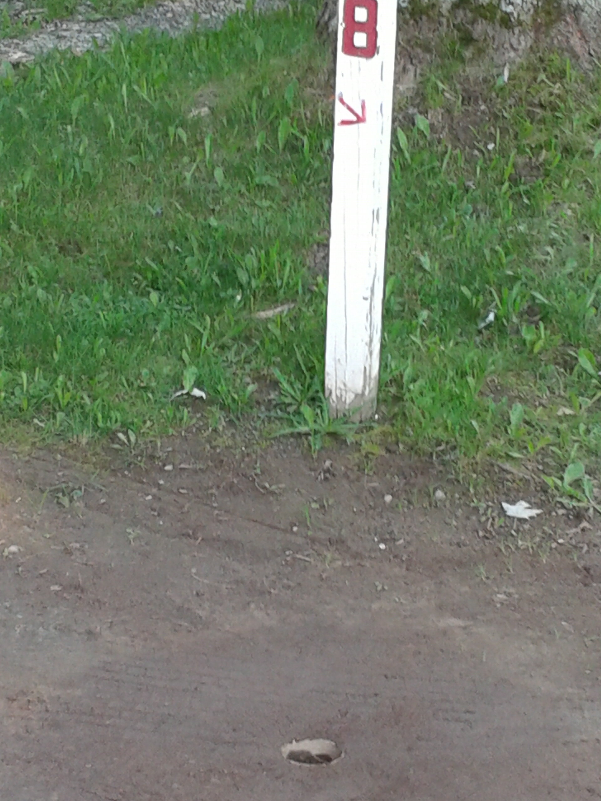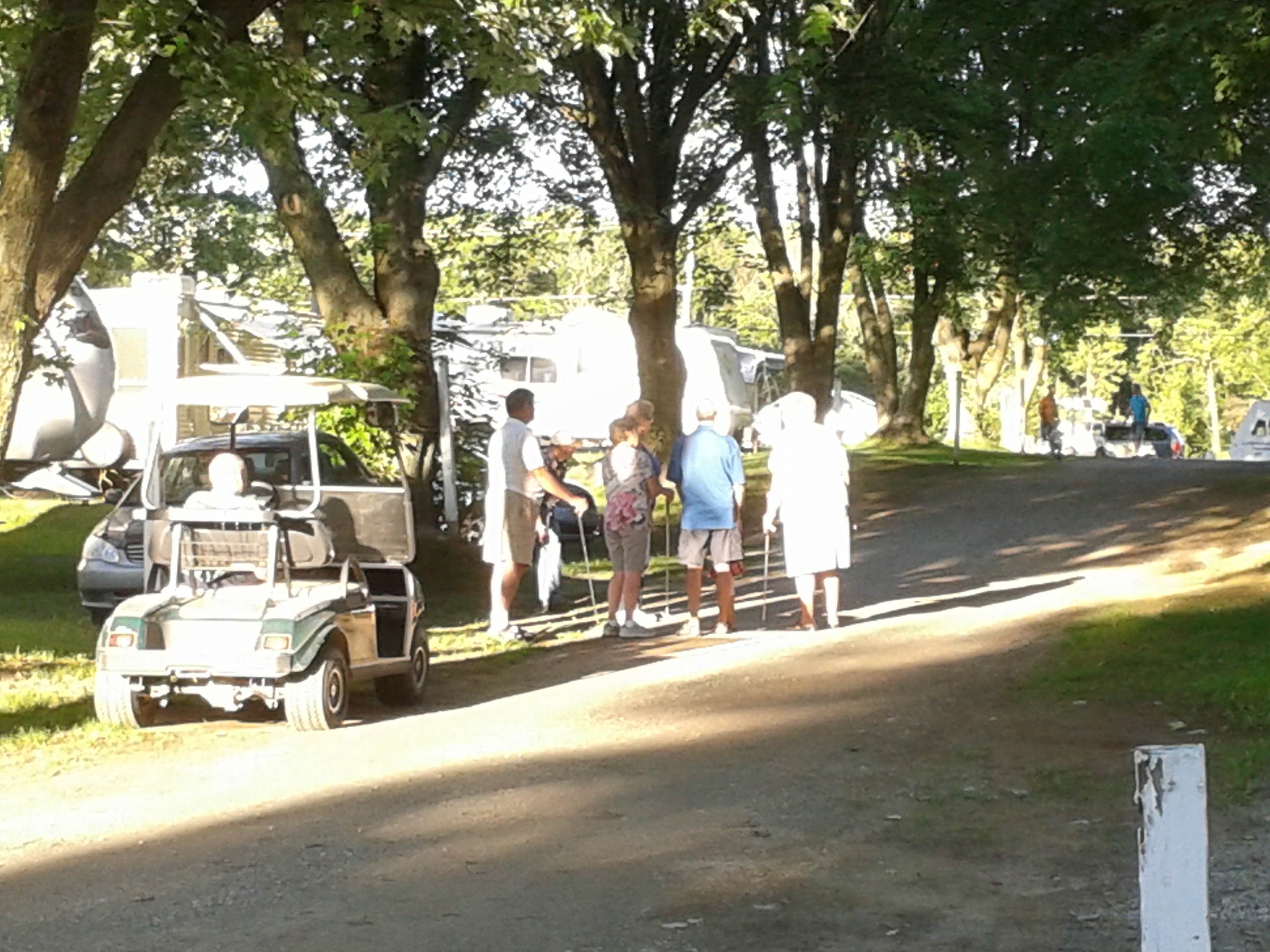 At any rate, we settled into a nice campground for the night. Leon poured the wine as I made grilled veggies and steak on the Barbie. Dinner was delicious! As we ate, we saw a group of older folks playing golf on the camping laneways. One lady was even wearing her golf glove and keeping score. I investigated it closer and saw that they have installed pipes that serve at golf holes to create a mini-put the length of this laneway. It seems a popular activity in the evening around here.