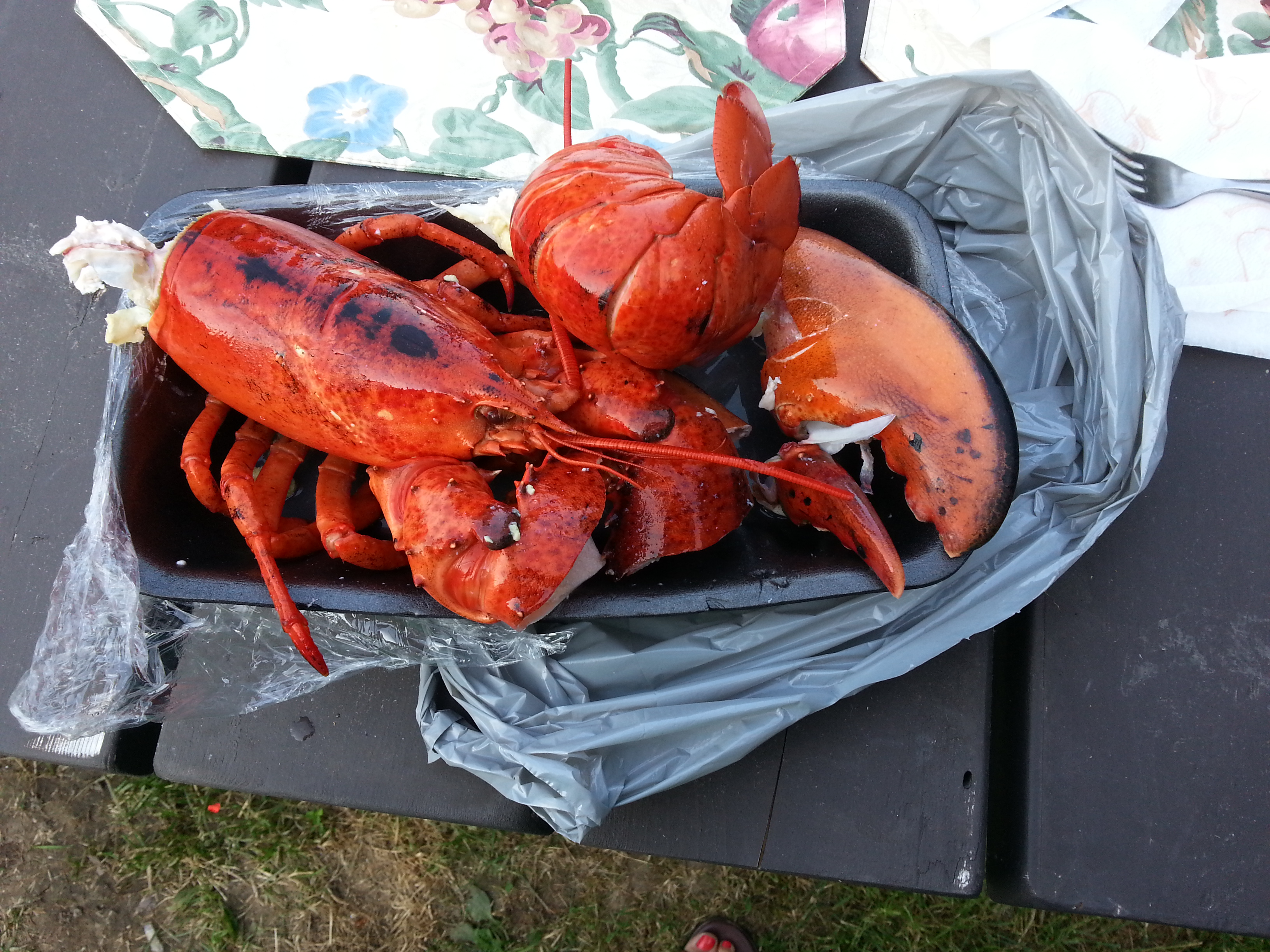 We travelled from Ste Anne des Monts to Forillon Park along the river. It’s a gorgeous drive that hugs the coast with high hills or mountains. We are at the end of the Appalachians here. We stopped in Grande Vallée, where a former neighbour of mine is from. Of course, we had to stop at the poisonnerie for a huge lobster for dinner. For $17, plus $1 for cracking it, we got a 2 lb lobster, suitable for a shore dinner at the park. We also stopped for lunch and ate some home made egg sandwiches at the city beach. Lovely little town.