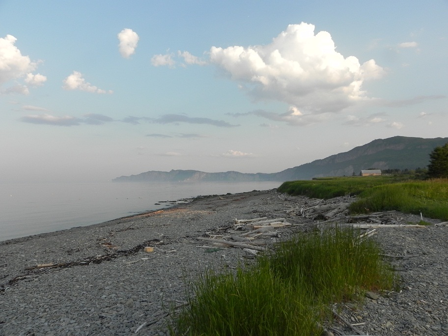 Our campground at Forillon was in the Desrosiers section. We had a slight view of the water from our picnic table area but it was a short enough walk to the beach, which reminded me of St. Tropez with the flat large pebbles. We made camp and had a nap, then after a great dinner, we were off on our bikes along the trail that follows the beach back to the lighthouse area. We were pretty sure we saw a seal but I couldn’t get a good picture of him, even with the focus lens.