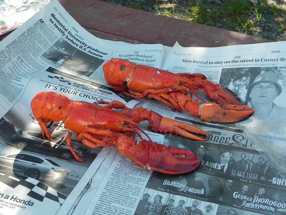 The ride back was really hard between the hills and the wind, but it was good to get some exercise after hiding from the bugs for so many days. We stopped at the local fish restaurant for 2 lobsters to take home to eat. Of course the feast was delicious!