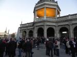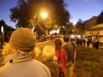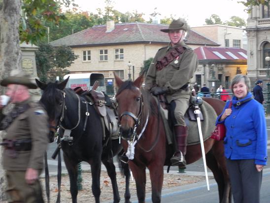 We got to the city core in time to see the crowds gather and line the streets of the procession. It was a simple service. First the pipes and drums arrived leading the way for the veterans. In Australia, people who have ancestors who have served are allowed to wear their medals and march in the procession as well. The 2 horsemen from the Australia Light Horse closed up the ranks as they proceeded from the Soldiers Memorial to the Cenotaph. After a brief ceremony, we walked towards the Soldiers Memorial where we were offered a sausage on bread and a coffee with a shot of rum. Pretty hardy breakfast at 7 in the morning! I did not partake. However, I did stop and speak to the nice rider and his horse.