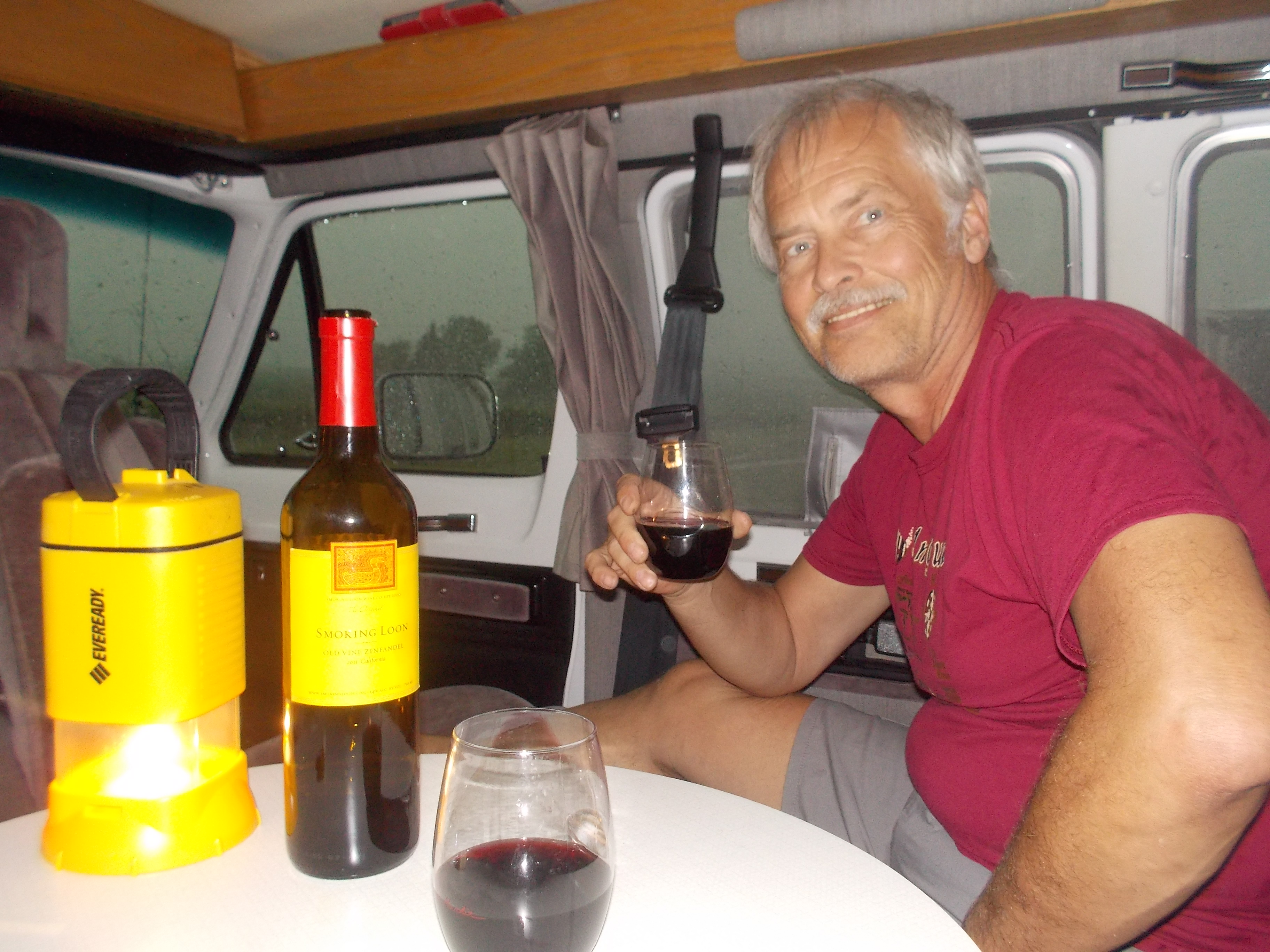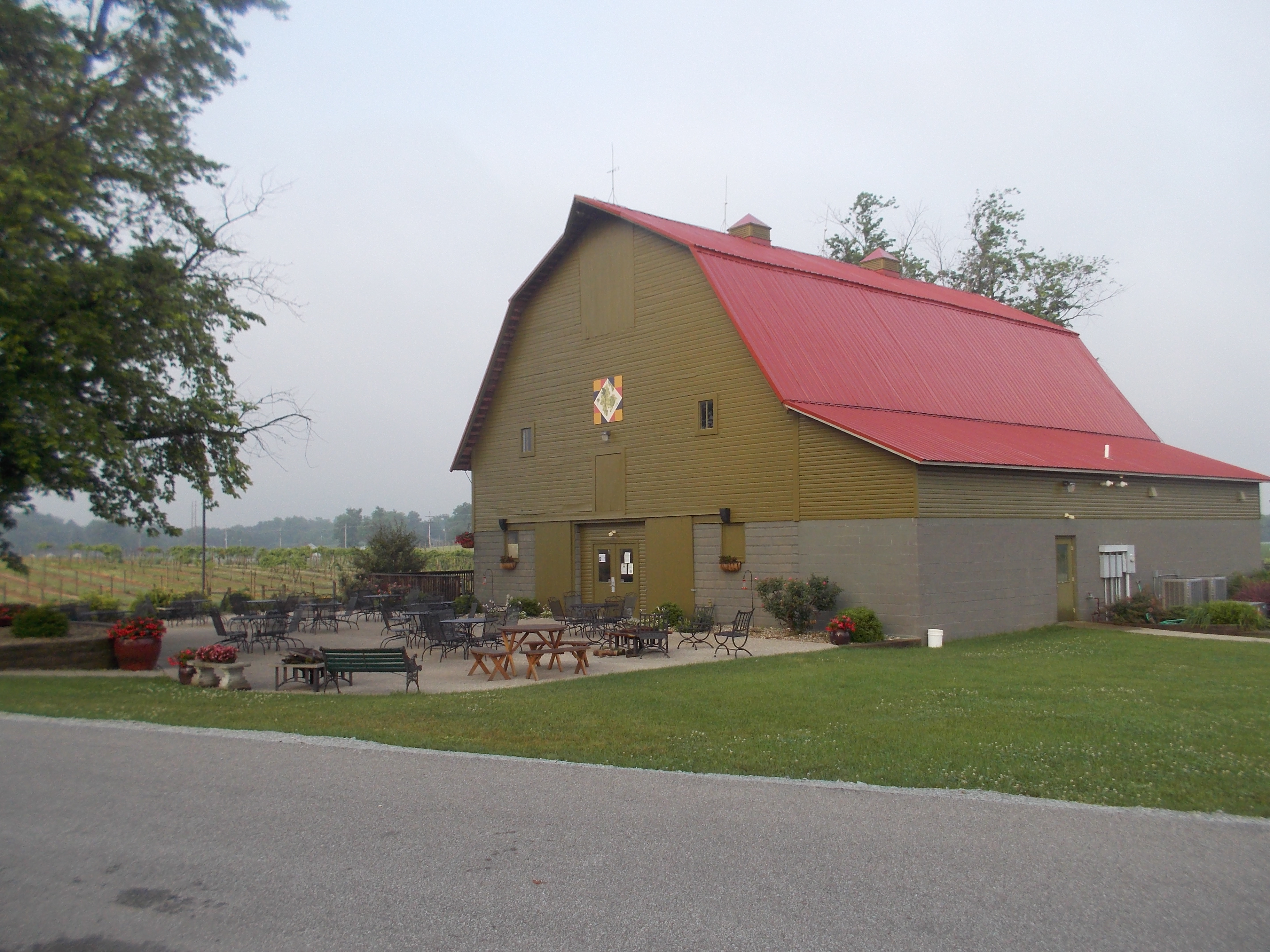 We arrived late after hitting road closures and traffic through Cincinnati. The rain was about to begin and we were glad to pull in to the Chateau de Pique winery. The estate is large, with a refurbished barn as a gift shop and tasting room, some outbuildings, a large party tent that can be seen for miles and what looks a bit like a coliseum. Of course there are vines and a wonderful view of the green corn fields across the road and down the hill. Very little of these details were noticed as we got there, more intent on parking on a level spot as this would be our home for the night.