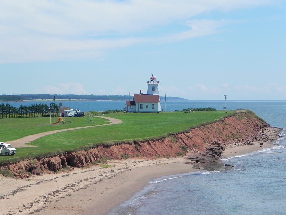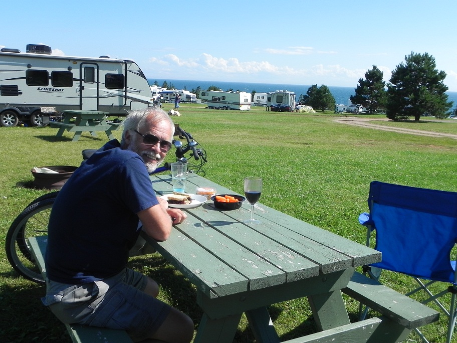 Our campground for the night was at Red Point Provincial Park.  When we got there, the day was so beautiful, the campground so well appointed, we decided to stay an extra night.  Our site was high on the hill, overlooking the Straight of Northumberland, with a view of Pictou and Cape Breton Island on the other side.  Neat or what?  And the beach was soft, squeaky sand.  Now, we didn’t know we had a squeaky sand beach right here, but you should have seen Leon doing a little dance to make the sand sing under his feet (they refer to it as singing sand here, not squeaking sand).Red Point lunch