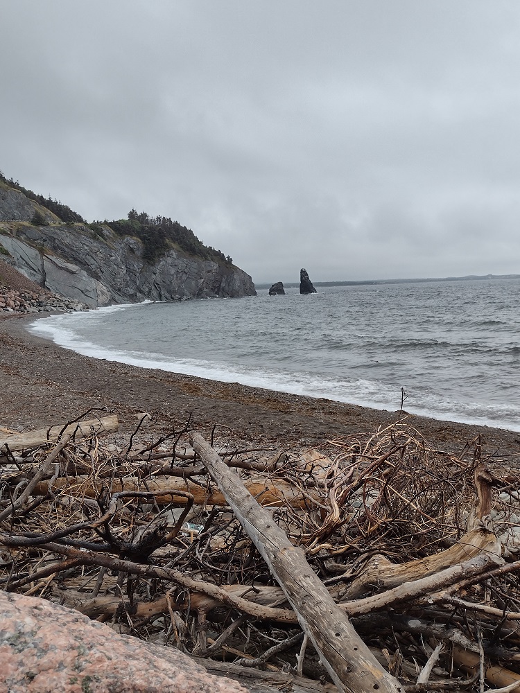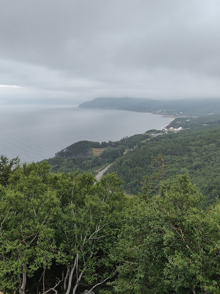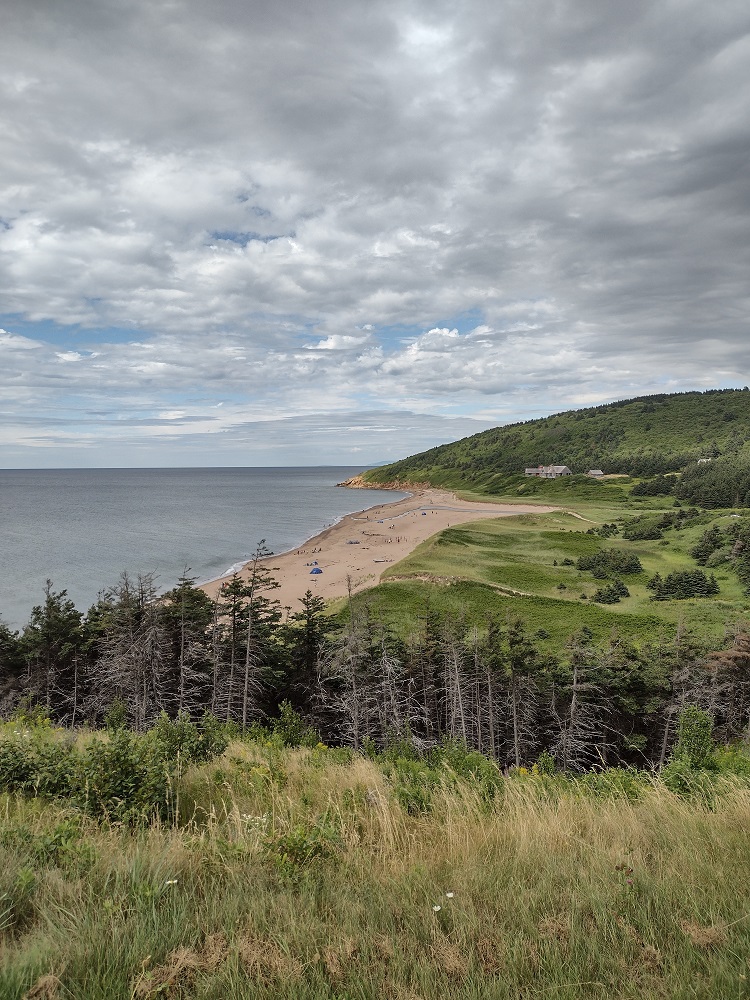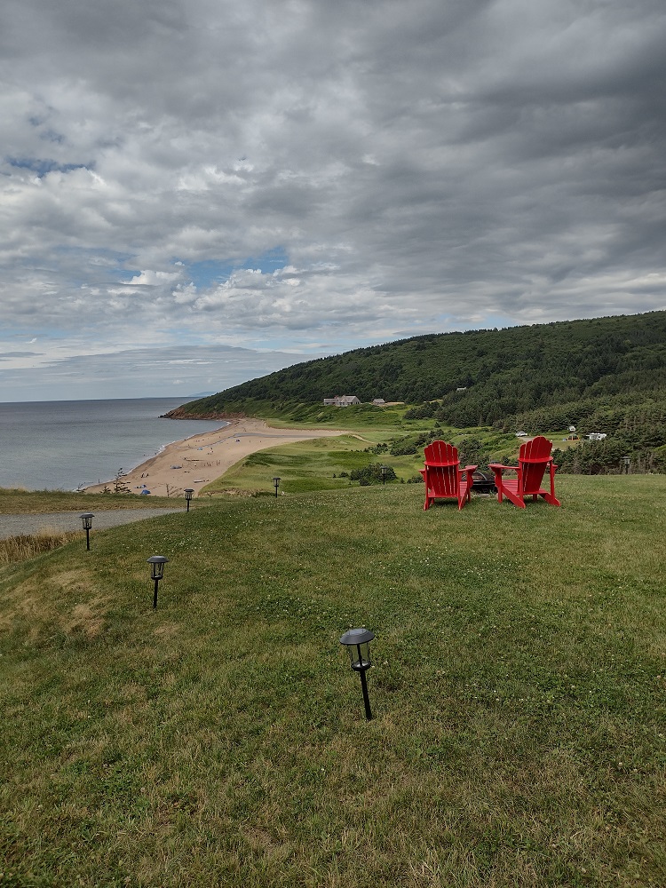 We wanted to sleep further up the coast and found an available site at McLeod’s in Dunvegan. This part of Cape Breton is very musical, with stars like the Rankin family originating from Mabou, nearby. The point was that there were all kinds of music festivals going on and finding a camping spot was not that easy. Nevertheless, we got a spot, way up on the ridge, among the very large seasonal trailers. The views were wonderful (check out that spot with the 2 red chairs or that very large estate built adjacent to the campground). We took a short walk on the beach, but didn’t swim. On our way back from the showers, we met some of the residents who invited to stay for a drink. Friendly folks, these Cape Breton people. We had a wonderful chat and they even told us about a campground further on that was run by people who lived in Langley, BC. You can be sure we stopped there next!